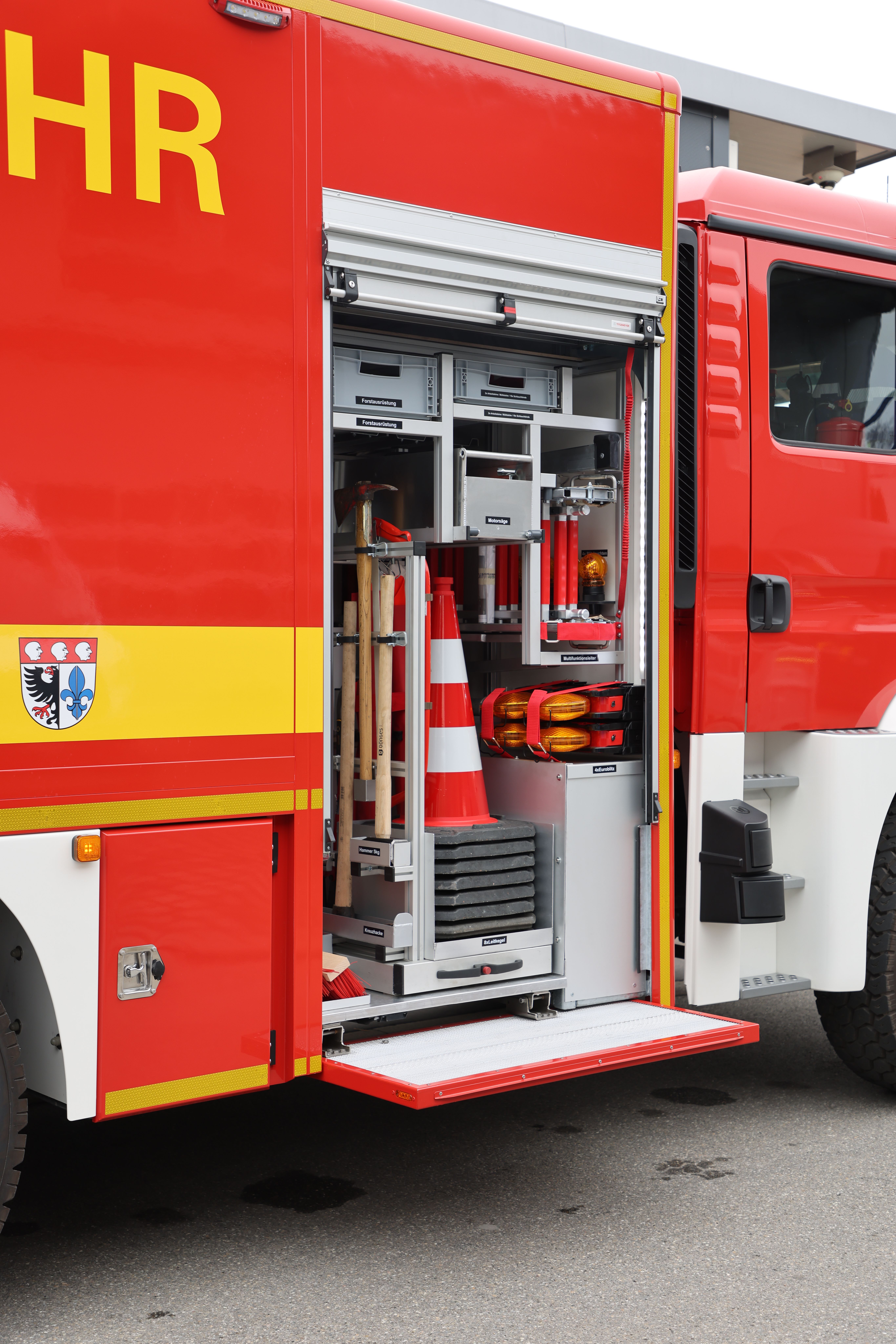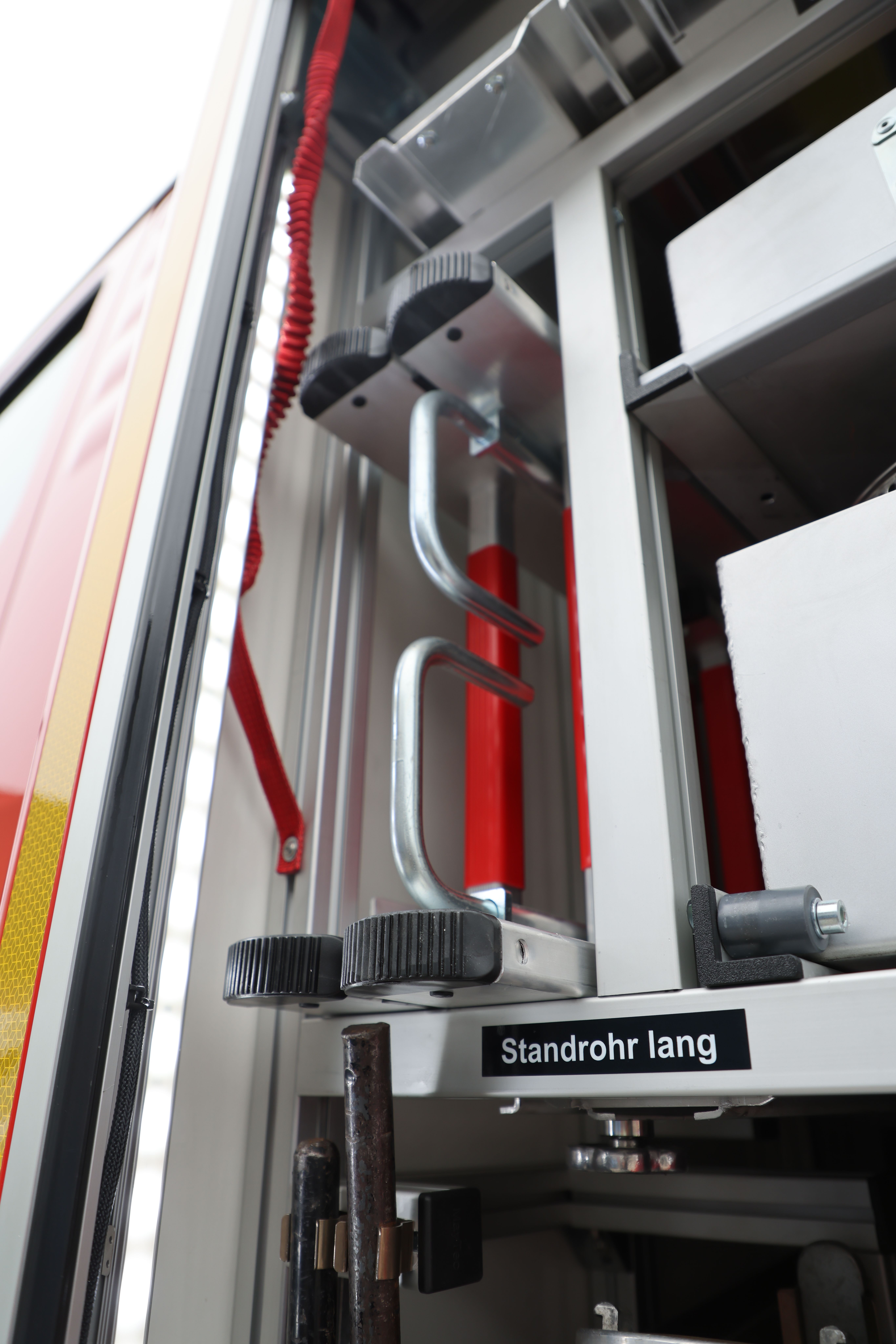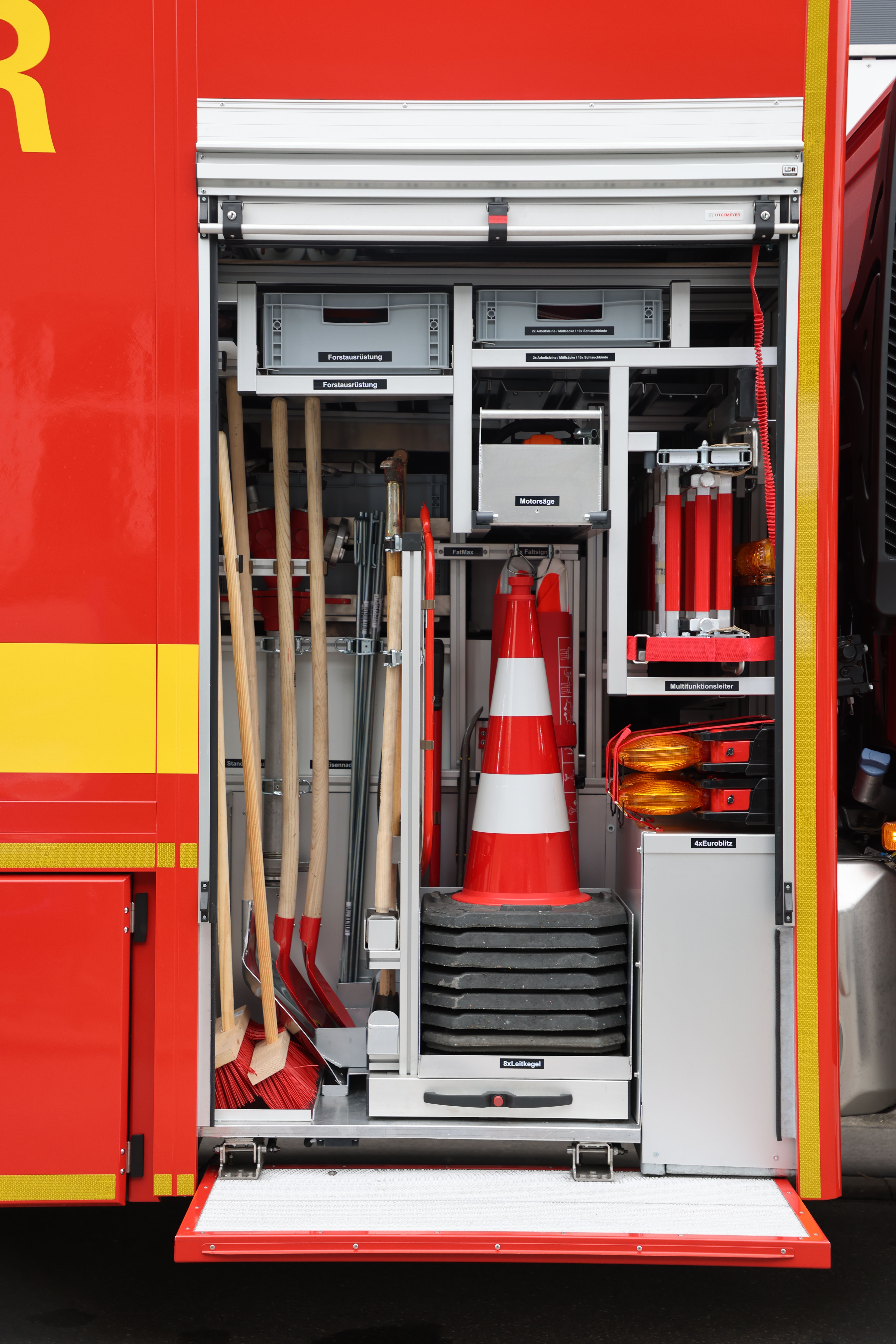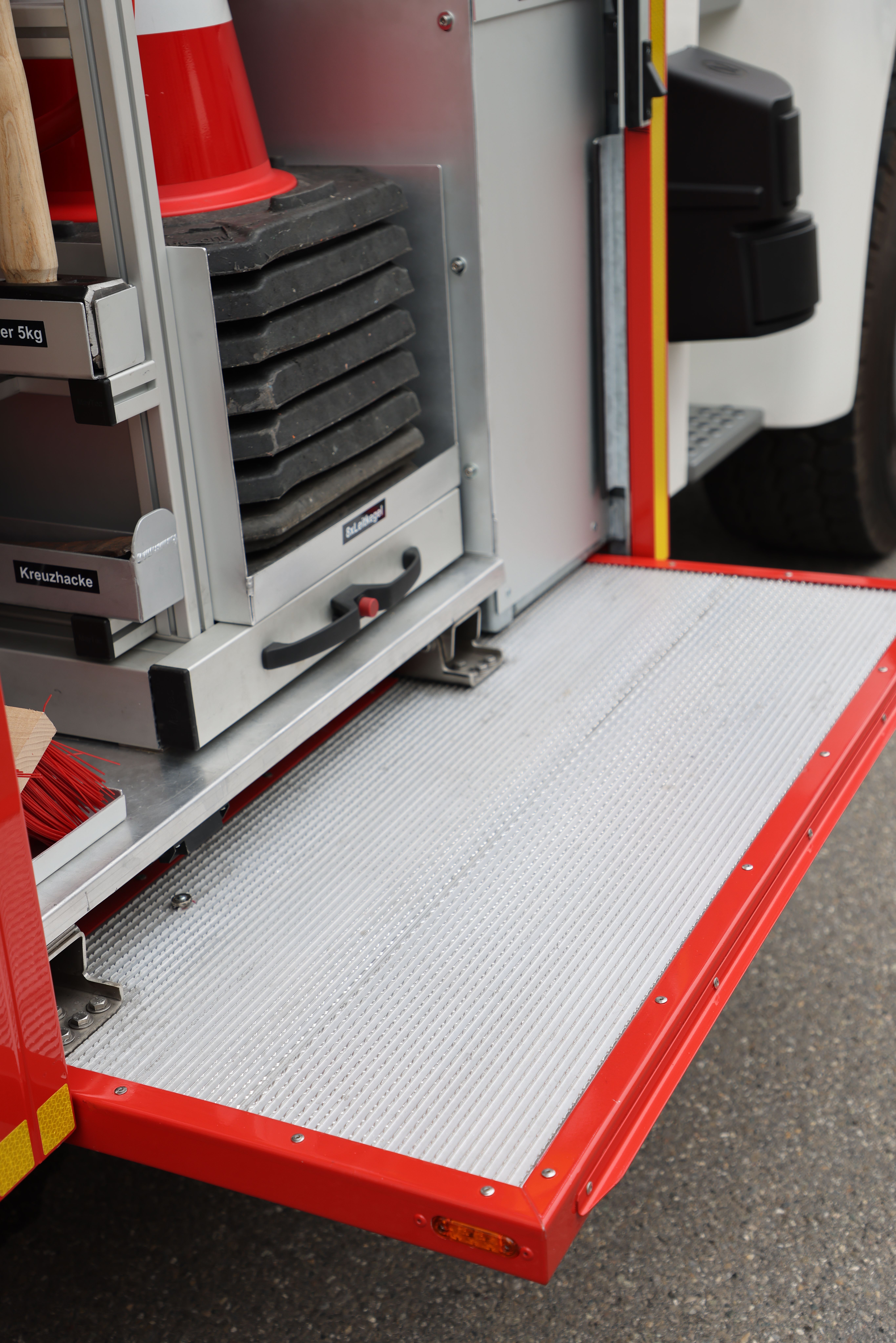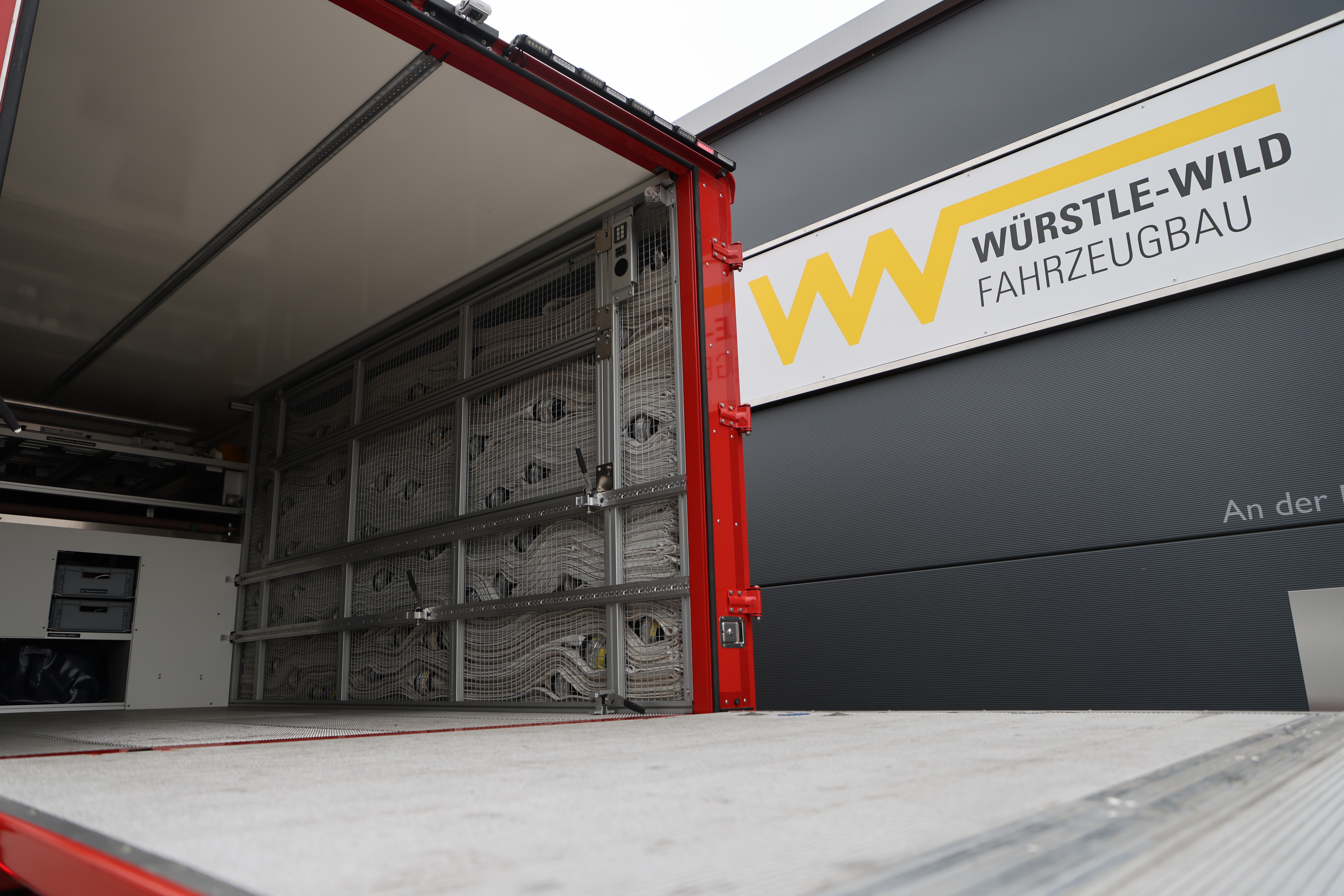 Ein Highlight ist die Unterbringung von 2 km Schlauchmaterial in den Außenwänden des Fahrzeugs. Diese sind schnell und einfach bei geschlossener Ladeboardwand während der Fahrt zu verlegen – ideal für längere Einsatzwege bei Brandeinsätzen. Bei dieser Technik bleibt noch Platz für weitere 6 Rollcontainer.