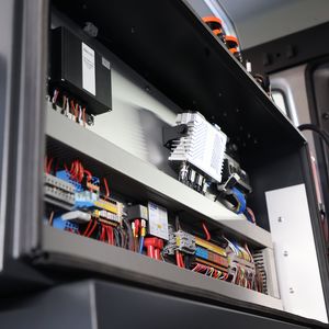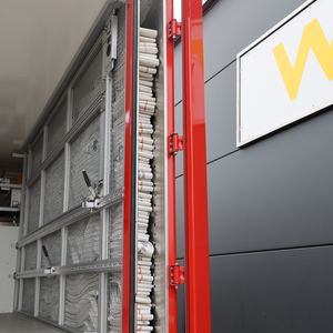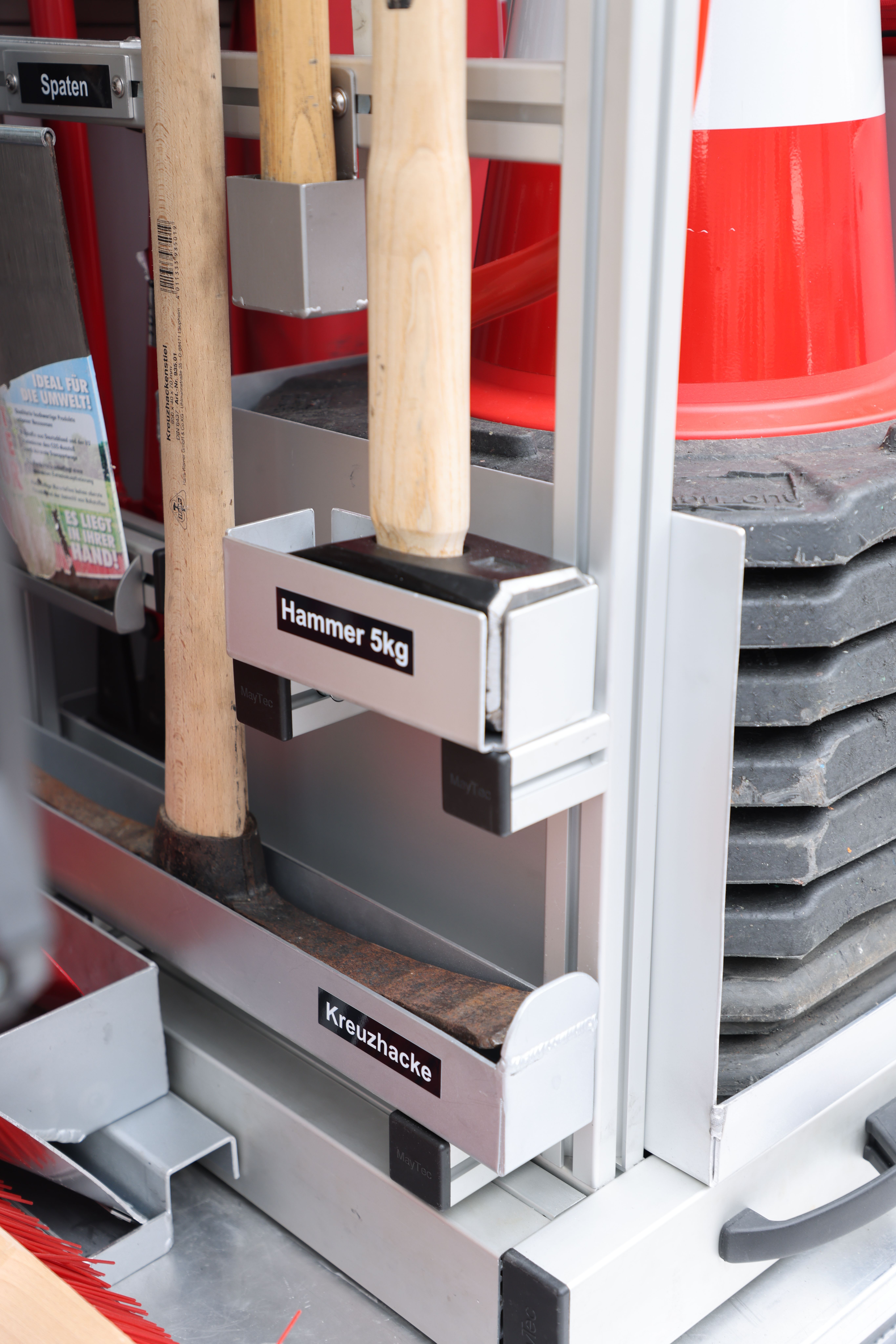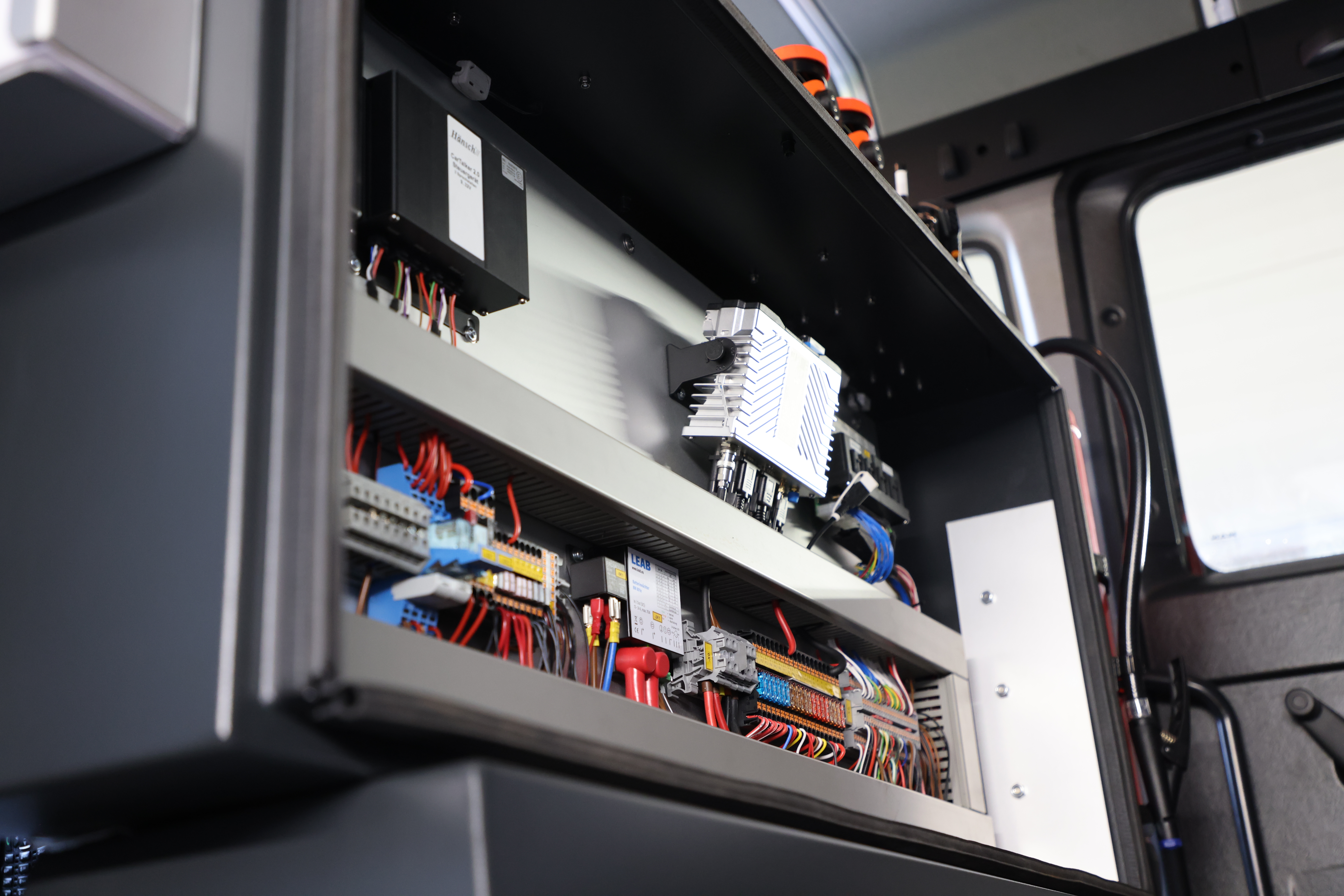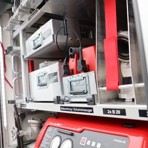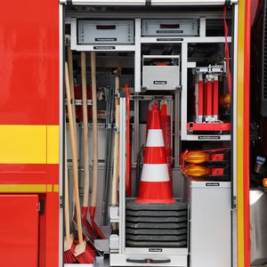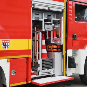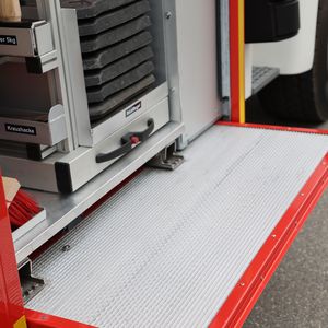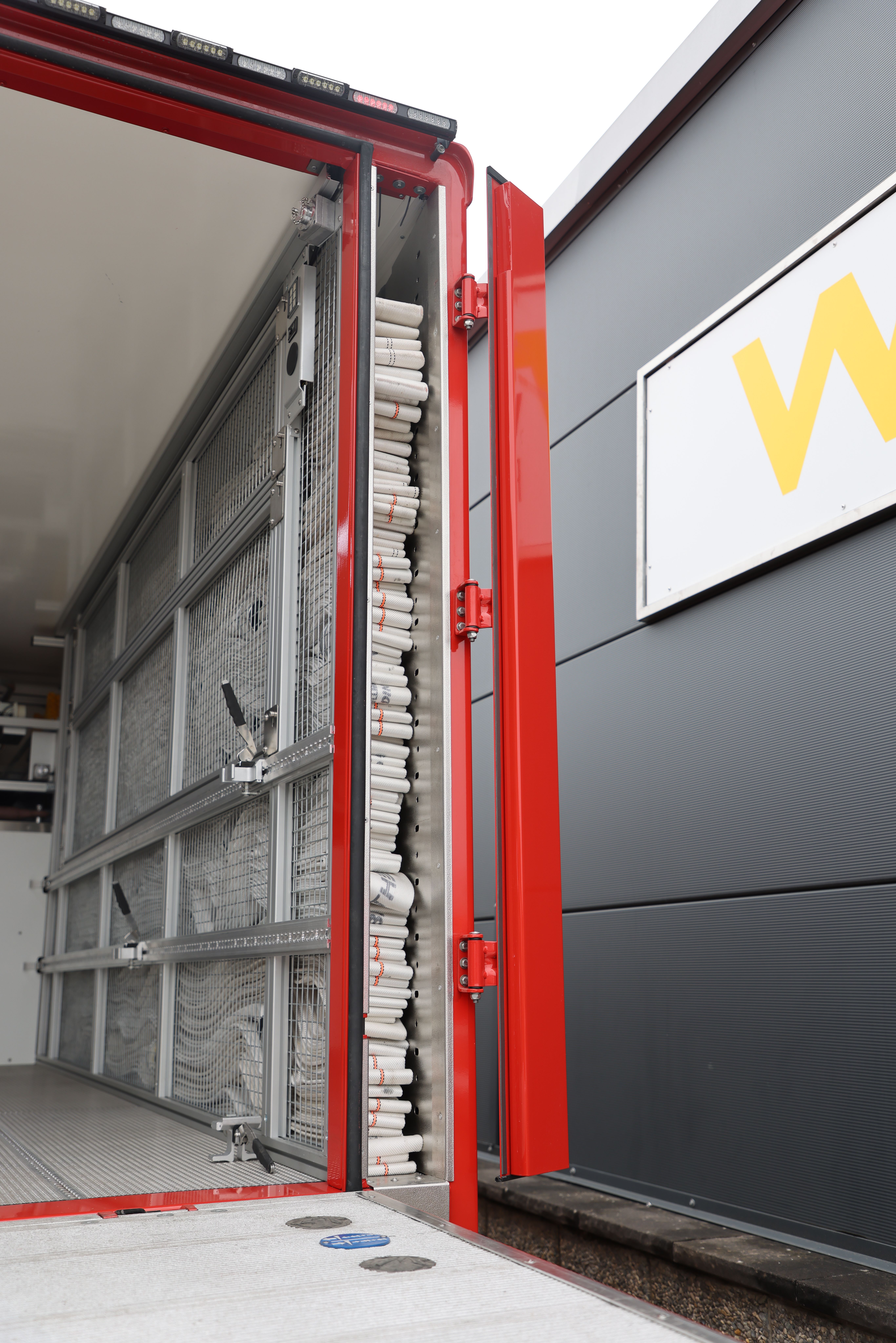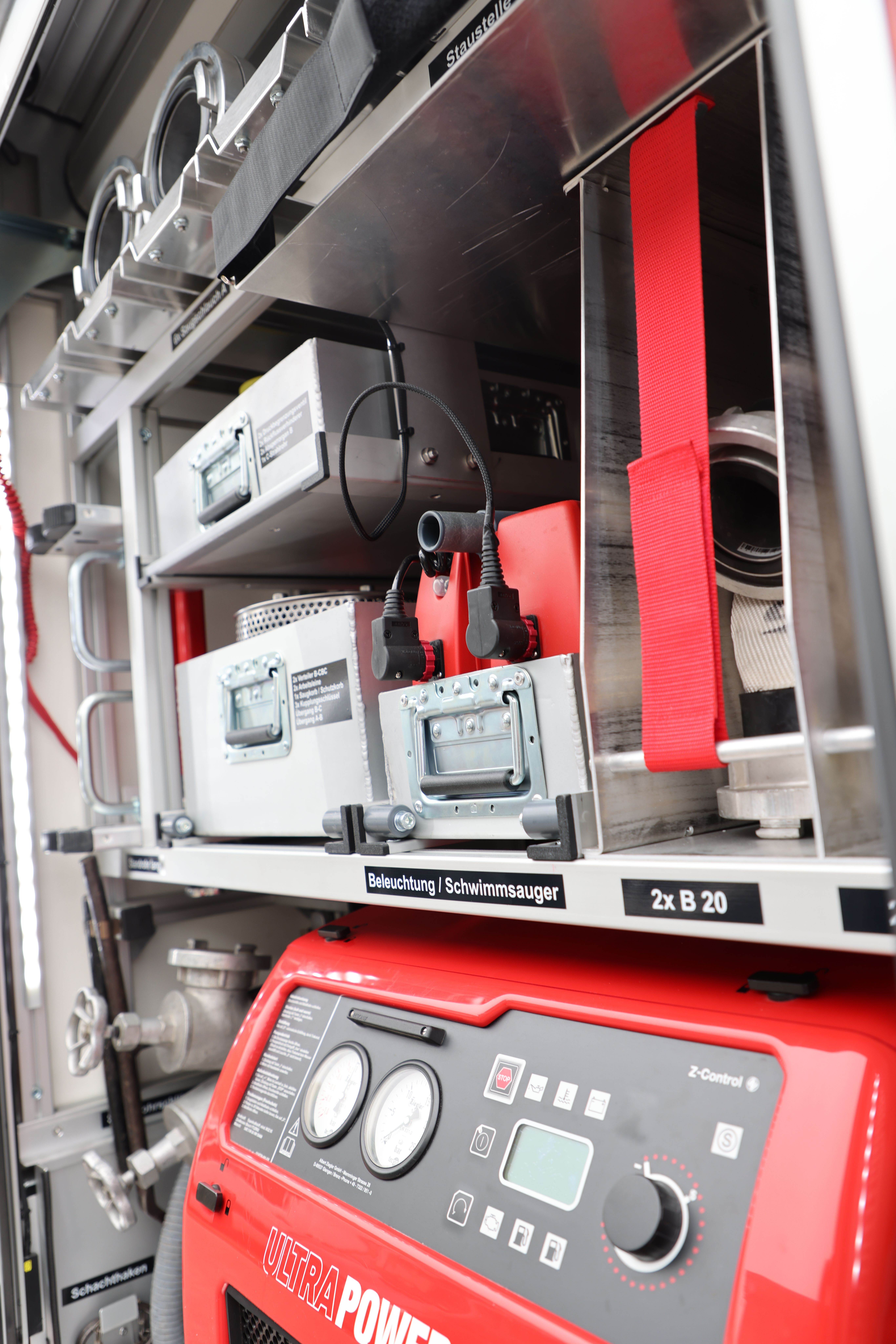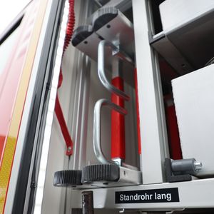 Ein Highlight ist die Unterbringung von 2 km Schlauchmaterial in den Außenwänden des Fahrzeugs. Diese sind schnell und einfach bei geschlossener Ladeboardwand während der Fahrt zu verlegen – ideal für längere Einsatzwege bei Brandeinsätzen. Bei dieser Technik bleibt noch Platz für weitere 6 Rollcontainer.
