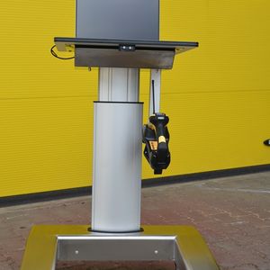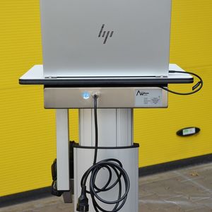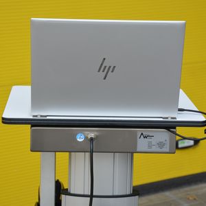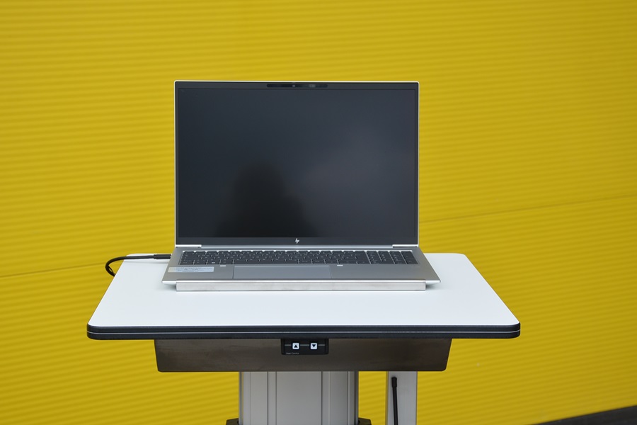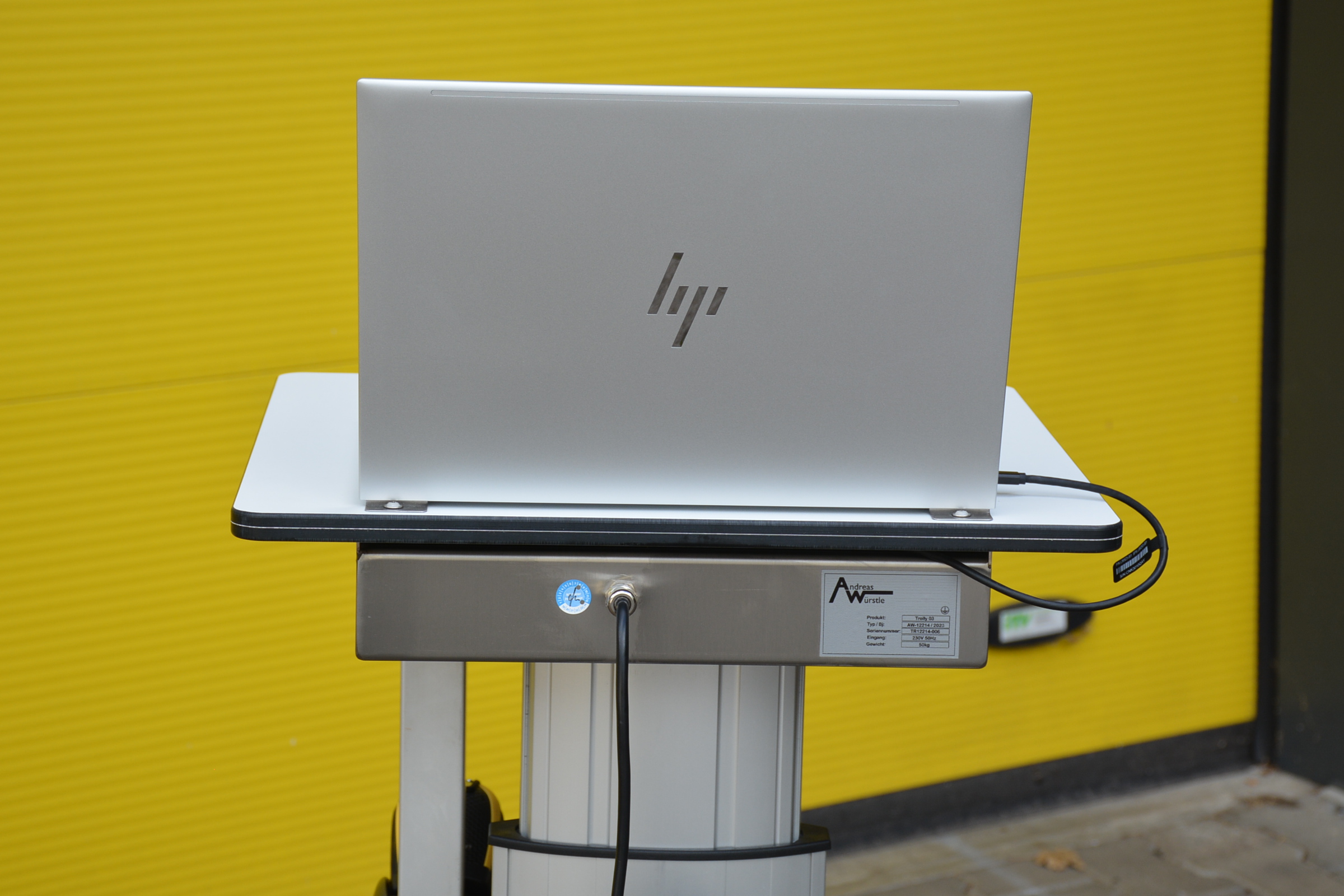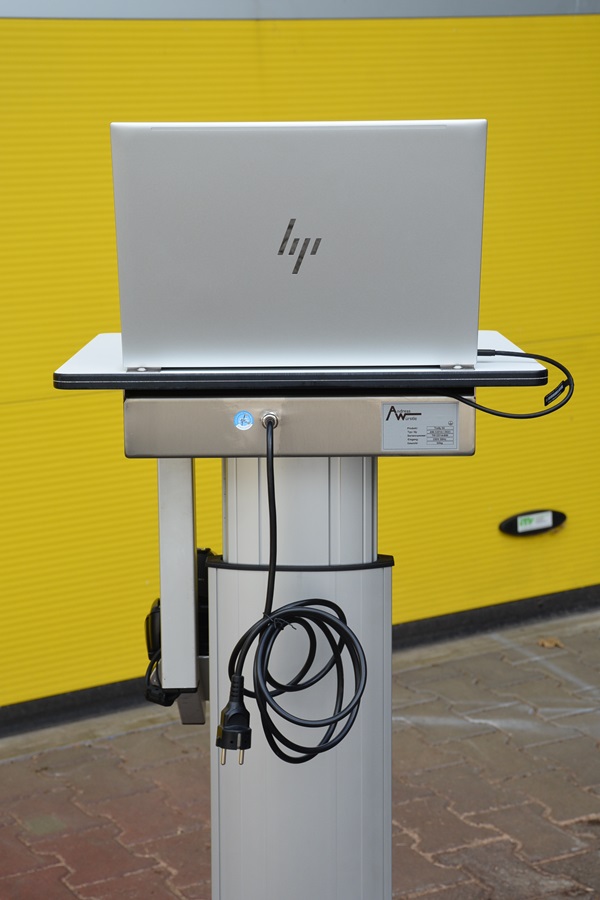 Im Gegensatz zu unseren anderen Medienwagen, die feste Bildschirme haben, haben wir uns für eine neue, flexible Lösung entschieden. Anstatt einen festen Bildschirm zu verwenden, wird ein Laptop sicher an unserem Medienwagen befestigt. Somit haben Sie die Möglichkeit, Ihren Arbeitsplatz individuell und nach Ihren Bedürfnissen anzupassen.